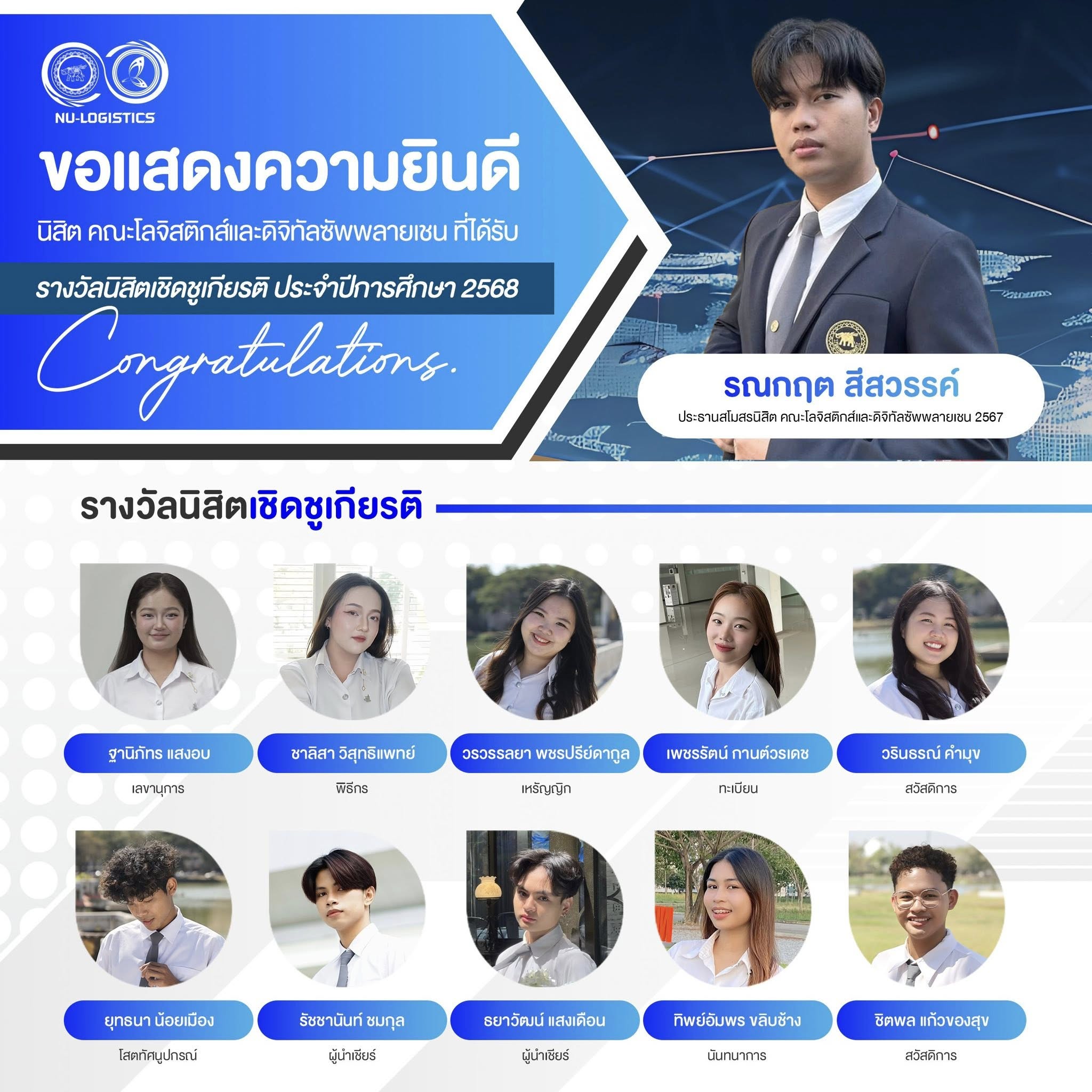 ขอแสดงความยินดีกับนิสิตคณะโลจิสติกส์และดิจิทัลซัพพลายเชนทุกท่านที่ได้รับรางวัลนิสิตเชิดชูเกียรติ ด้านกิจกรรมเสริมหลักสูตร ประจำปีการศึกษา 2567