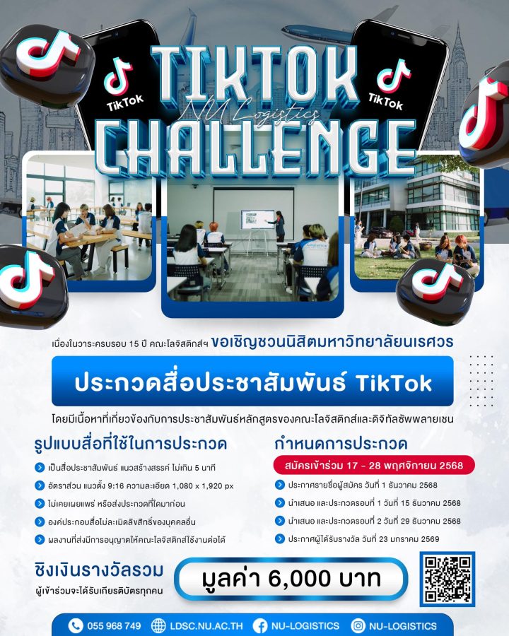 ขอเชิญชวนนิสิต มหาวิทยาลัยนเรศวร ประกวดสื่อประชาสัมพันธ์ TikTok โดยมีเนื้อหาที่เกี่ยวข้องกับการประชาสัมพันธ์หลักสูตรของคณะโลจิสติกส์และดิจิทัลซัพพลายเชน มหาวิทยาลัยนเรศวร