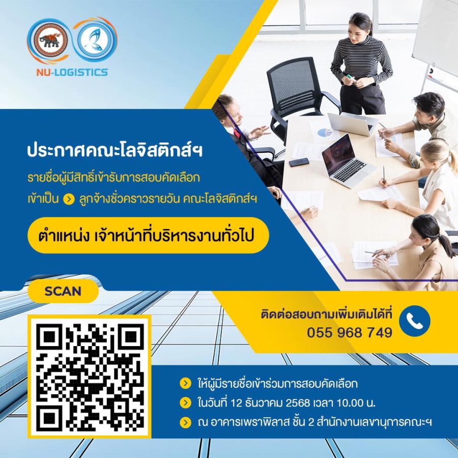 ▶️ ให้ผู้มีรายชื่อเข้ารับการสอบคัดเลือกในวันที่ 12 ธันวาคม 2568 เวลา 10.00 น. เป็นต้นไป ณ อาคารเพราพิลาศ ชั้น 2 สำนักงานเลขานุการ คณะโลจิสติกส์และดิจิทัลซัพพลายเชน