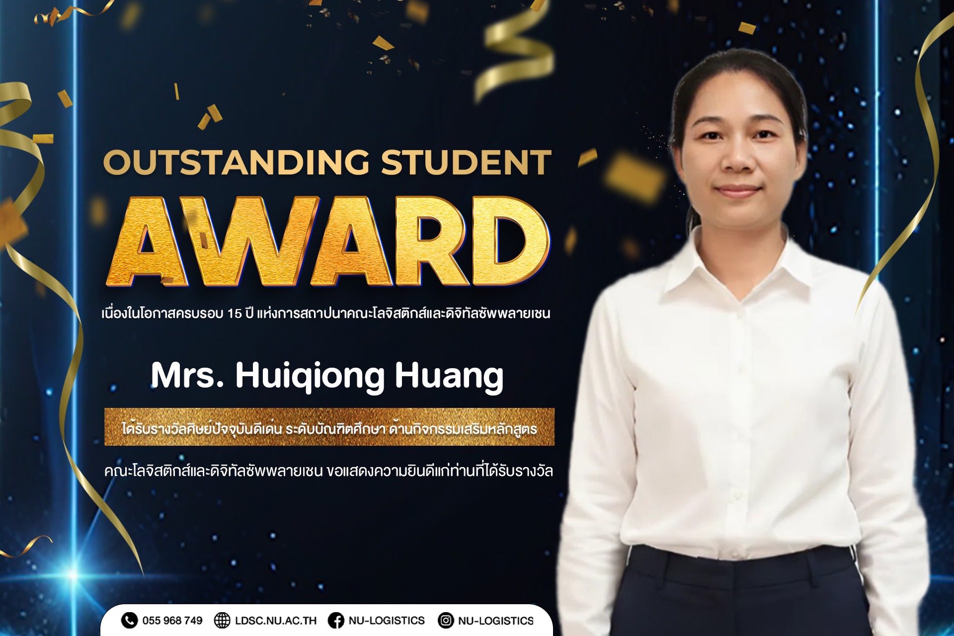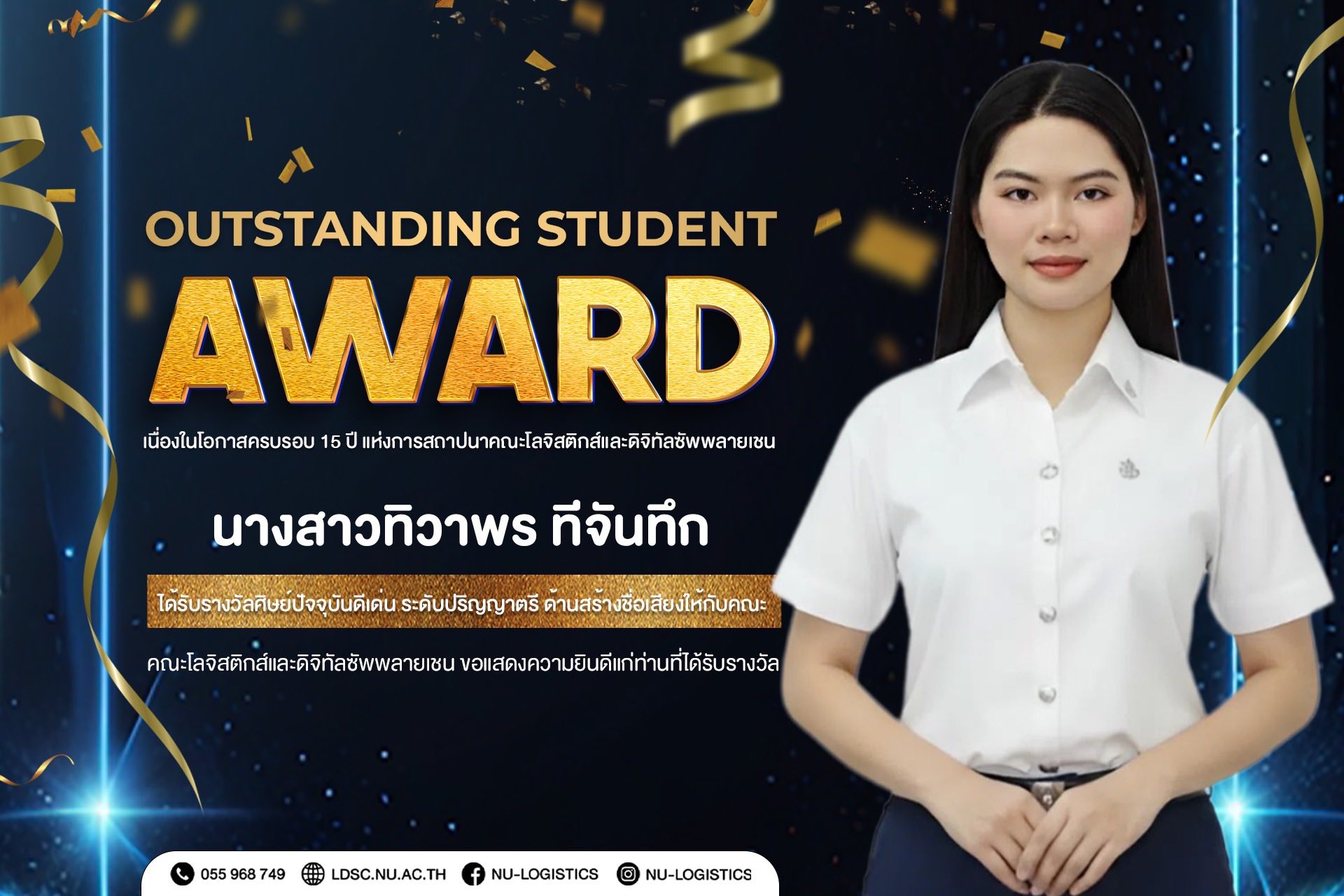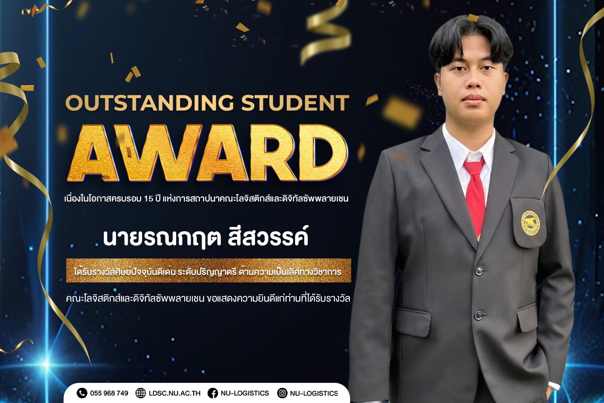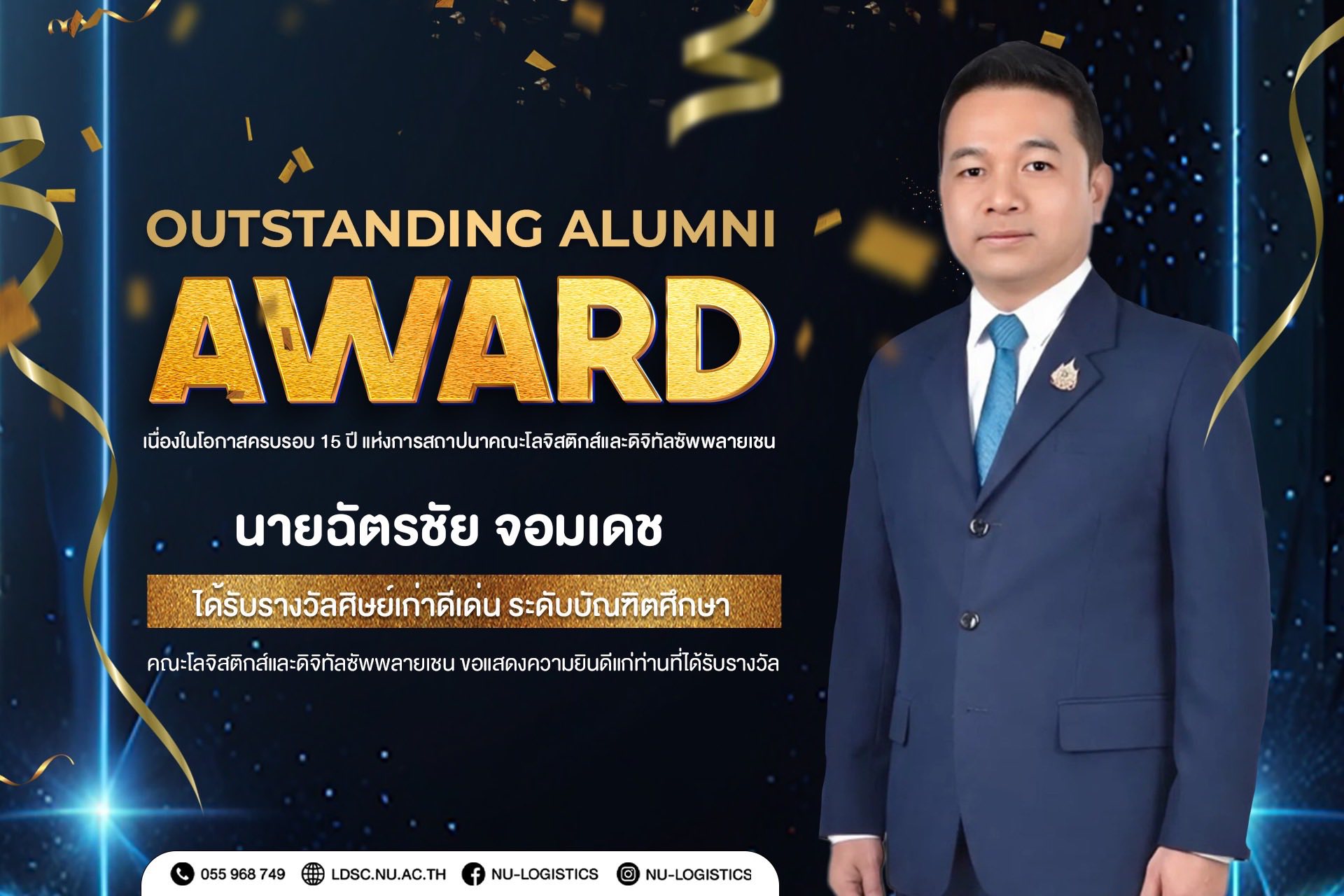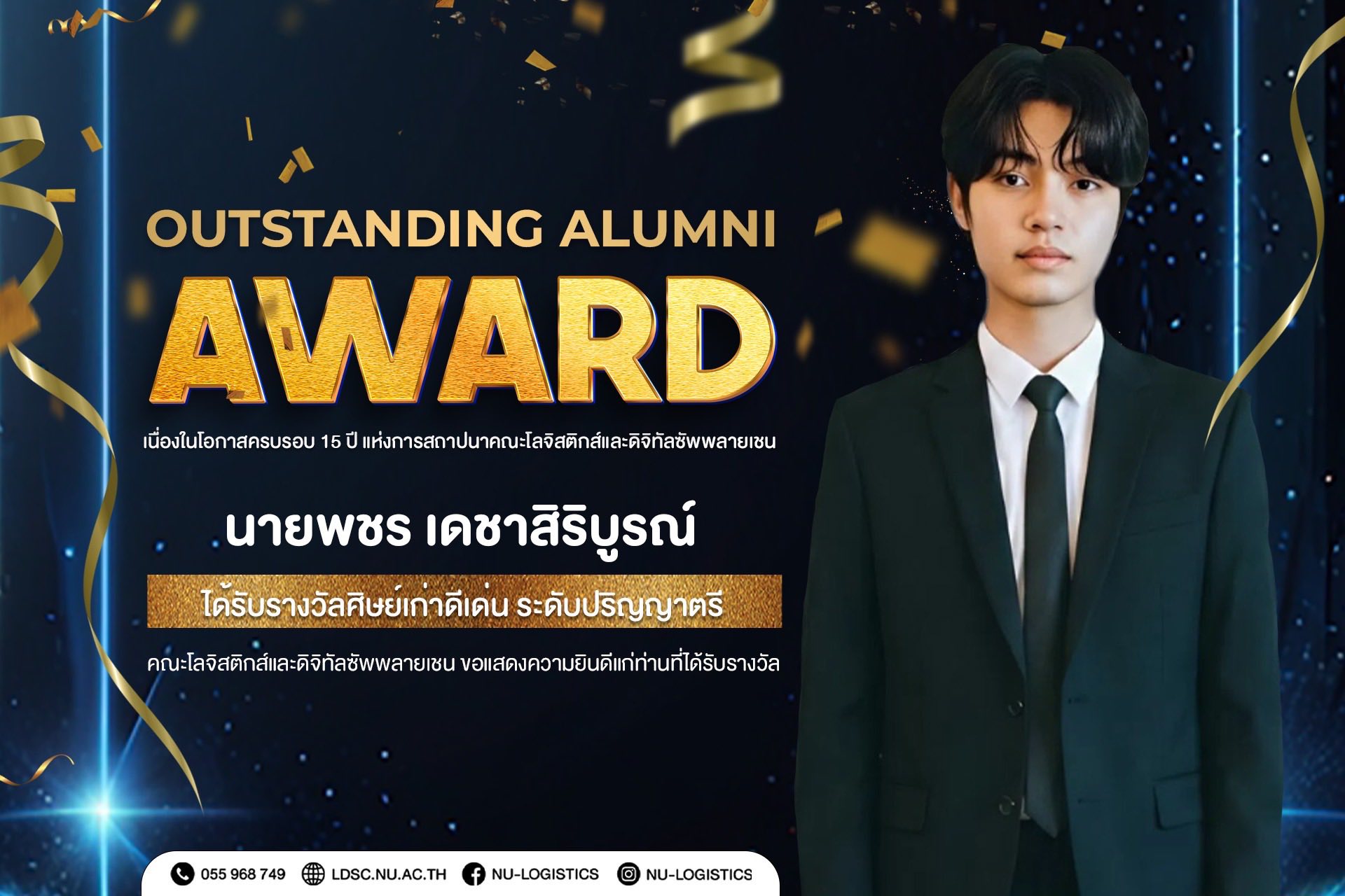 คณะโลจิสติกส์และดิจิทัลซัพพลายเชน ขอแสดงความยินดีกับผู้ได้รับรางวัลศิษย์เก่าดีเด่น และศิษย์ปัจจุบันดีเด่น (Outstanding Student & Alumni Award) เนื่องในโอกาสครบรอบ 15 ปี คณะโลจิสติกส์และดิจิทัลซัพพลายเชน