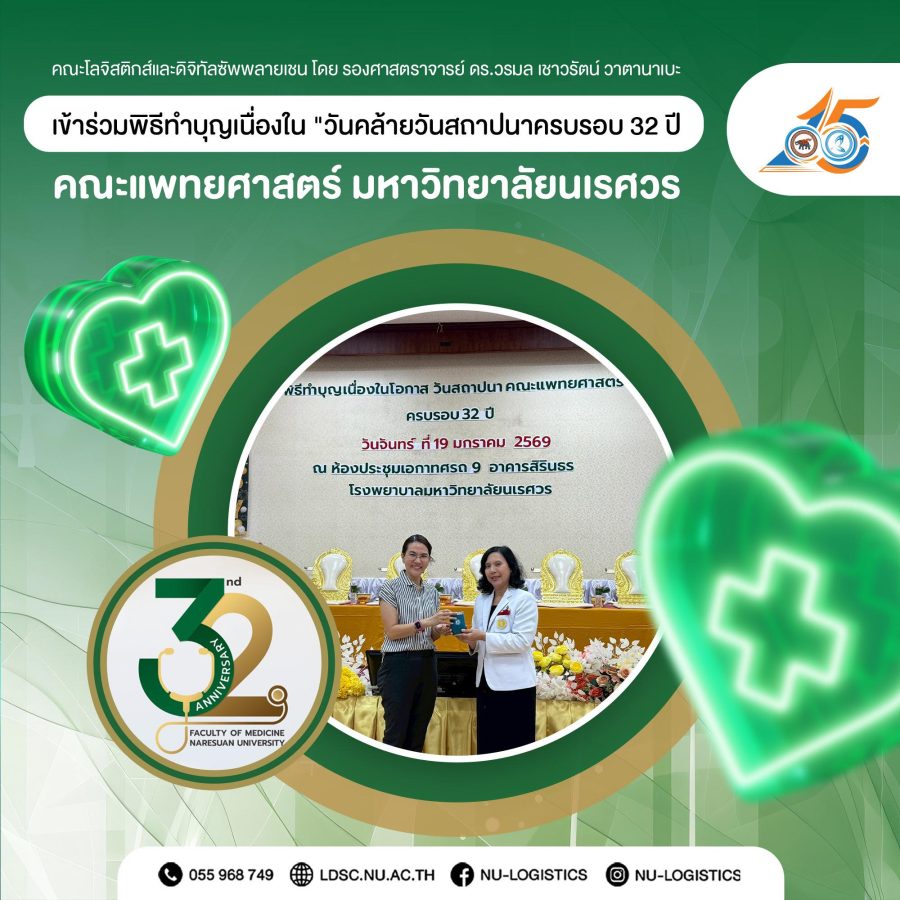 เมื่อวันที่ 19 มกราคม 2569 ที่ผ่านมา คณะโลจิสติกส์และดิจิทัลซัพพลายเชน นำโดย รองศาสตราจารย์ ดร.วรมล เชาวรัตน์ วาตานาเบะ ได้เข้าร่วมพิธีทำบุญและร่วมแสดงความยินดี เนื่องในโอกาสวันคล้ายวันสถาปนาคณะแพทยศาสตร์ มหาวิทยาลัยนเรศวร ครบรอบ 32 ปี (32nd Anniversary Faculty of Medicine)