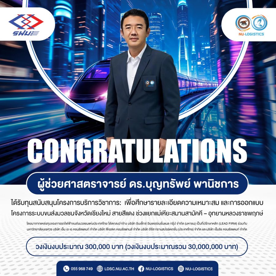 คณะโลจิสติกส์และดิจิทัลซัพพลายเชน มหาวิทยาลัยนเรศวร ขอแสดงความยินดีกับ ผู้ช่วยศาสตราจารย์ ดร.บุญทรัพย์ พานิชการ ในโอกาสได้รับทุนสนับสนุนโครงการบริการวิชาการ เพื่อขับเคลื่อนระบบขนส่งมวลชนอย่างยั่งยืน