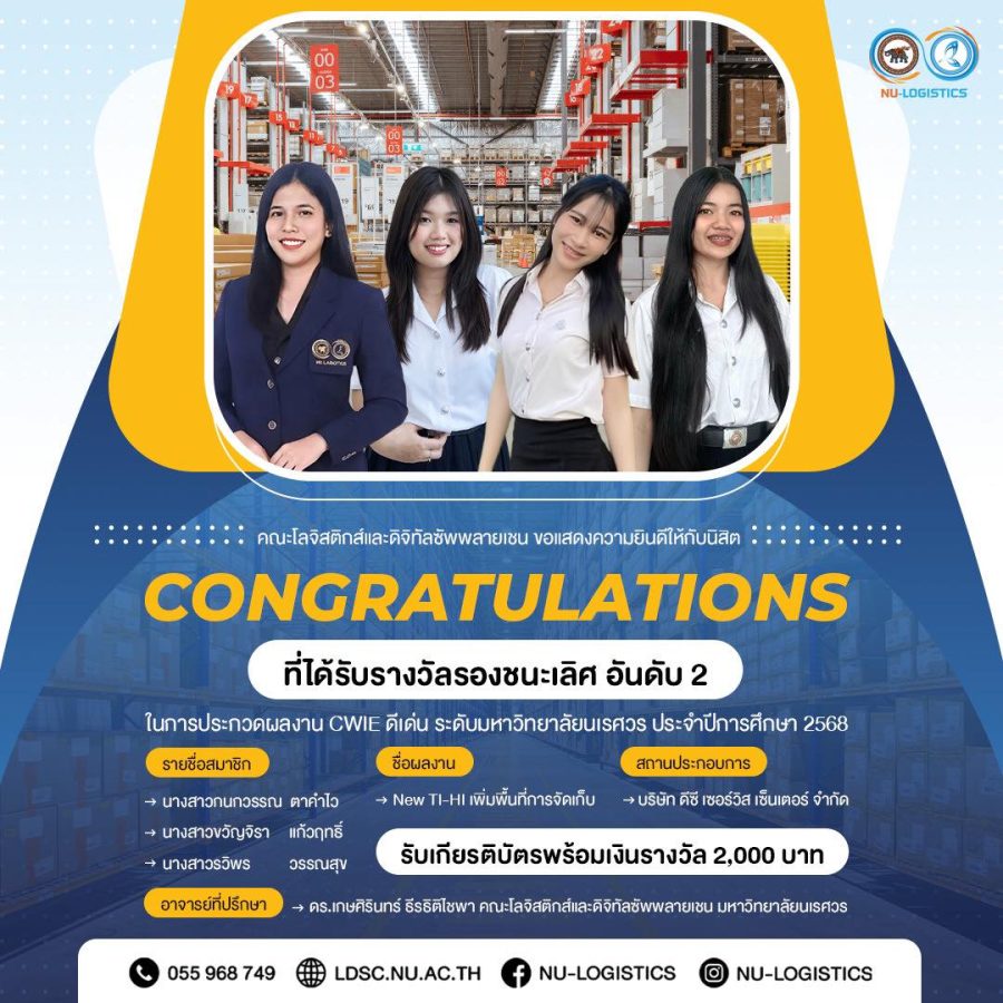 คณะโลจิสติกส์และดิจิทัลซัพพลายเชน ขอแสดงความยินดีกับนิสิต ในโอกาสได้รับ รางวัลรองชนะเลิศ อันดับ 2 จากการประกวด CWIE ดีเด่น ระดับมหาวิทยาลัยนเรศวร ประจำปีการศึกษา 2568